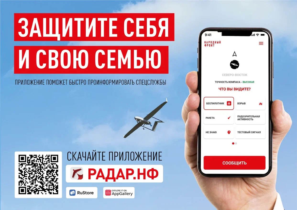 Общероссийское общественное движение «НАРОДНЫЙ ФРОНТ «ЗА РОССИЮ» разработало бесплатное мобильное приложение «Радар.НФ», позволяющее любому лицу фиксировать беспилотные летательные аппараты (далее — БПЛА) и в режиме реального времени передавать информацию в разведку Воздушно- космических сил Российской Федерации для проверки и принятия необходимых мер.